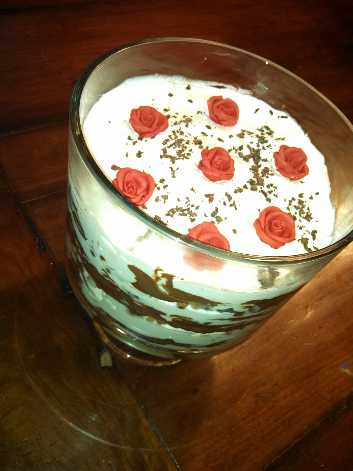I made it in a trifle, and doubled the recipe to make it tall enough. All from scratch, and topped with fondant roses (okay, those were pre-packaged). In case you didn't know, Bulgaria produces 70% of the world's perfume rose oil.